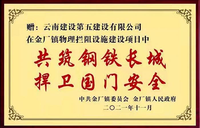 “共筑鋼鐵長(cháng)城 捍衛國門(mén)安全”,金廠(chǎng)鎮對公司在金廠(chǎng)鎮物理阻攔設施項目建設中同心同向、共克時(shí)艱、迎難而上的付出表示誠摯感謝。
