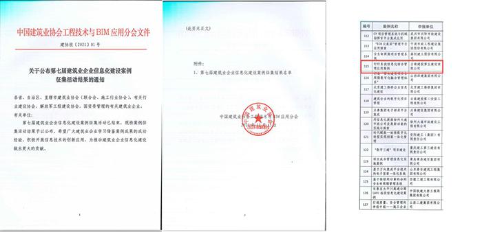 近日,中國建筑業(yè)協(xié)會(huì )工程技術(shù)與BIM應用分會(huì )發(fā)布了《關(guān)于公布第七屆建筑業(yè)企業(yè)信息化建設案例征集活動(dòng)結果的通知》(建協(xié)技[2021]01號),由公司申報的《釘釘系統信息化綜合管理應用案例》獲評第七屆建筑業(yè)企業(yè)信息化建設案例Ⅲ類(lèi)成果。