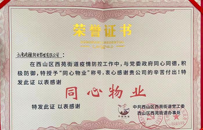 近日,公司南疆物業(yè)收到昆明市西山區西苑街道辦事處寄來(lái)的感謝信。西苑街道辦事處對南疆物業(yè)公司積極響應號召、義無(wú)反顧參加社區疫情防控工作致以崇高的敬意和衷心的感謝,并授予“同心物業(yè)”稱(chēng)號。