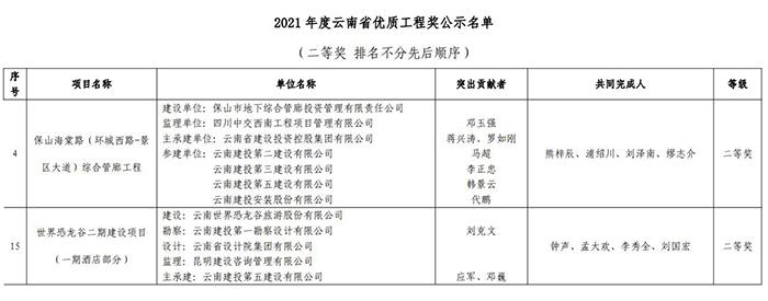 近日,云南省建筑業(yè)協(xié)會(huì )公布了2021年度云南省優(yōu)質(zhì)工程獲獎名單,公司承建的保山海棠路(環(huán)城西路-景區大道)綜合管廊工程、世界恐龍谷二期建設項目(一期酒店部分)2個(gè)項目榮獲二等獎。