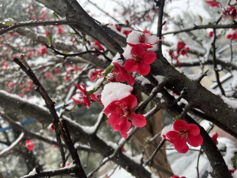 雪,冰封了一切。大院里的木瓜樹(shù)開(kāi)花了,熱情地接受著(zhù)這冰冷的一切。熱烈的綻放。