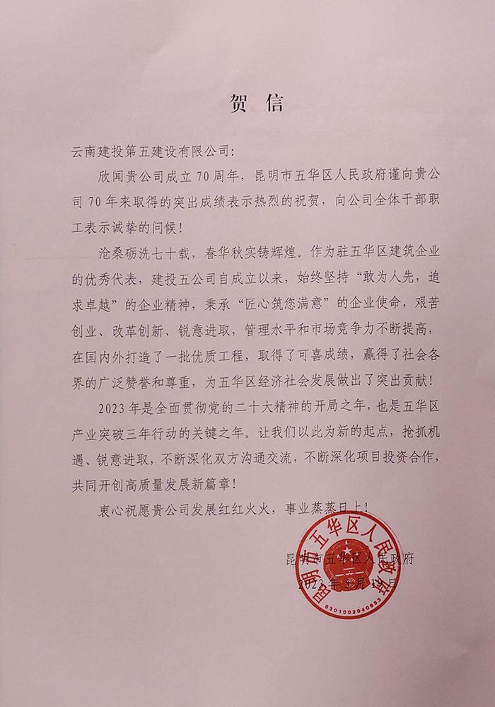 公司建司70周年之際,五華區人民政府送來(lái)賀信,向公司70年來(lái)取得的成績(jì)表示祝賀,向公司全體干部職工表示問(wèn)候。