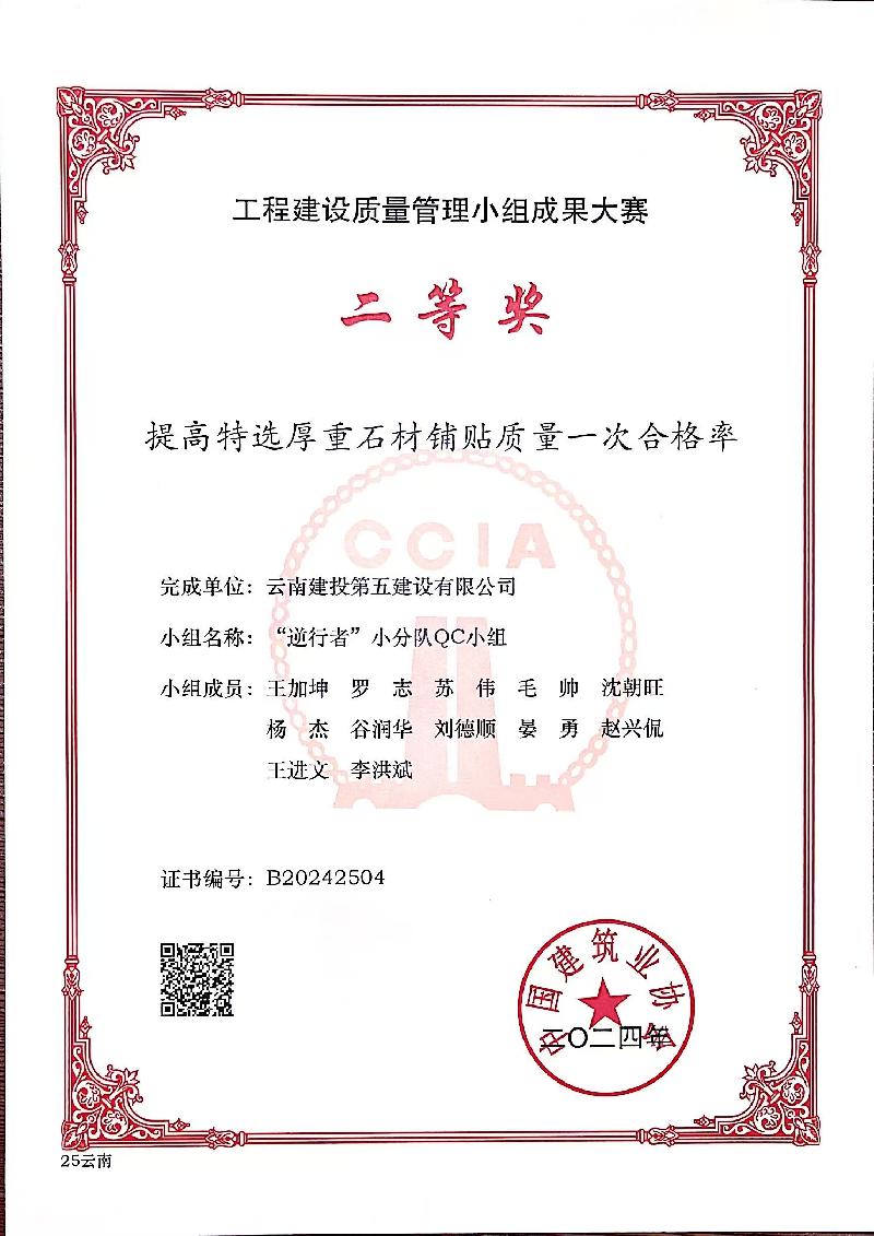 近日,昆明市建筑業(yè)協(xié)會(huì )、云南省建筑業(yè)協(xié)會(huì )及中國建筑業(yè)協(xié)會(huì )相繼頒發(fā)了2024年度工程建設質(zhì)量管理小組活動(dòng)成果,公司憑借精細化的過(guò)程質(zhì)量管理和精益求精的品質(zhì)管理,榮獲2024年度中國建筑業(yè)協(xié)會(huì )工程建設質(zhì)量管理小組成果二等獎1項、云南省工程建設優(yōu)秀質(zhì)量管理小組成果11項、昆明市工程建設優(yōu)秀質(zhì)量管理小組成果4項,獲評昆明市建筑業(yè)協(xié)會(huì )“質(zhì)量管理優(yōu)秀企業(yè)”榮譽(yù)稱(chēng)號。