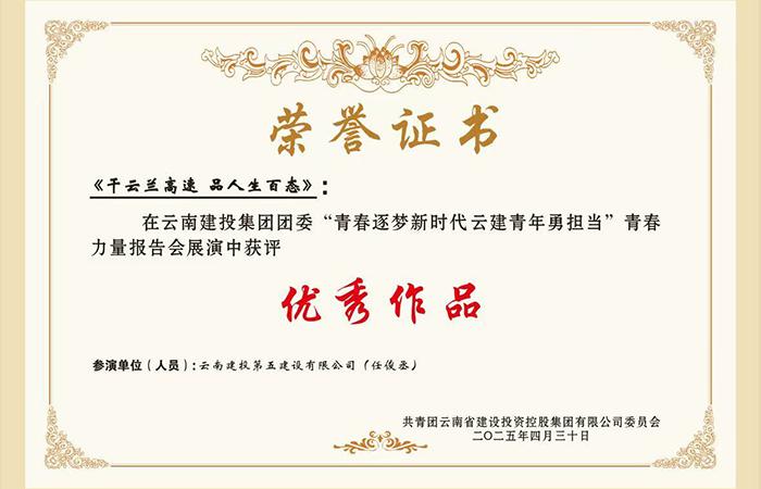 2025年五四青年節,集團舉辦“青春逐夢(mèng)新時(shí)代 云建青年勇?lián)敗鼻啻毫α繄蟾鏁?huì )。展演中,由公司團委、市政路橋四部聯(lián)合編創(chuàng )的脫口秀《干云蘭高速,品人生百態(tài)》作品獲評“優(yōu)秀作品”。