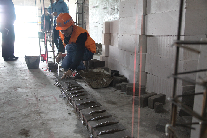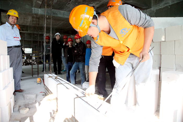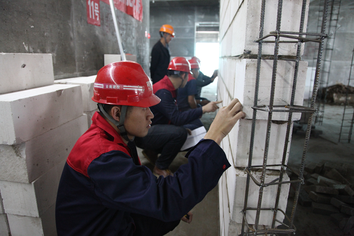 比賽當天,在所有參賽選手進(jìn)行安全教育及競賽相關(guān)注意事宜后,九點(diǎn)整,各參賽選手及其助手便各就各位,在海源財富中心項目6幢號上演了一場(chǎng)精彩的競技PK賽,經(jīng)過(guò)1個(gè)半小時(shí)的激烈比拼,其中的12個(gè)砌磚小組在規定時(shí)間內完成了比賽內容。本次競賽現場(chǎng)設有10名裁判進(jìn)行現場(chǎng)監督,并嚴格按照砌體結構工程施工質(zhì)量驗收規范進(jìn)行考核,從工藝、質(zhì)量、熟練度等方面進(jìn)行綜合評比出優(yōu)勝者。