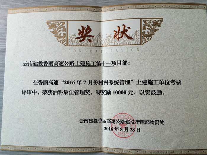 項目部在2016年獲得產(chǎn)值累計位列全線(xiàn)第一名,獎勵人民幣30萬(wàn)元;項目部按期完成主線(xiàn)施工便道貫通,給予全線(xiàn)通報表?yè)P,獎勵人民幣10萬(wàn)元,香麗高速全線(xiàn)13家土建參建單位目前只有第三項目部和第十一項目部主線(xiàn)施工便道順利貫通;項目部的物資部在指揮部“7月份材料系統管理”考核評審中榮獲油料最佳管理獎,獎勵10000元,在“8月份材料系統管理”考核評審中榮獲第一名,獎勵20000元。項目部在2016年共獲得4個(gè)獎項,共計43萬(wàn)元的獎金。項目部將再接再厲,持續前進(jìn)。