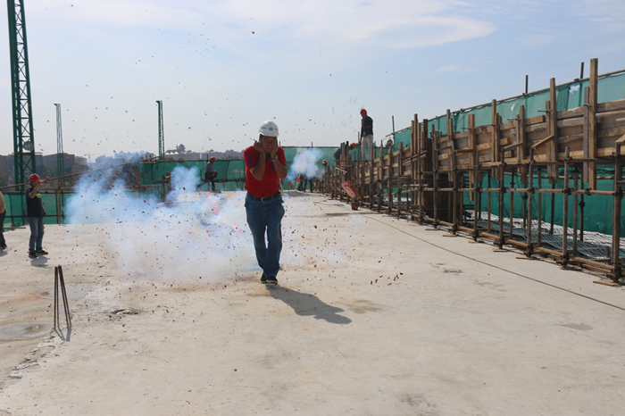 封頂儀式上云南體育運動(dòng)職業(yè)技術(shù)學(xué)院院長(cháng)李錫云及書(shū)記陳麟在結構屋面層點(diǎn)燃了鞭炮以祝賀綜合訓練館1軸-10軸/L軸屋面斜梁完成了最后一方混凝土的澆筑,這也預示著(zhù)項目正式轉入二次結構及裝飾裝修施工階段。