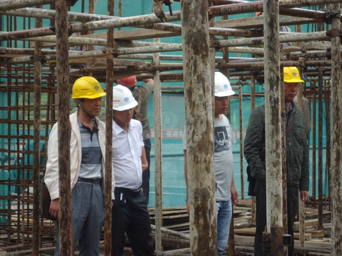 焦倫杰一行首先對生化膜池進(jìn)行實(shí)地觀(guān)查,詳細了解膜池及設備區高支模的相關(guān)技術(shù)和操作細節后,指出施工現場(chǎng)存在的安全問(wèn)題,并要求項目部及時(shí)進(jìn)行整改,針對雨季施工面臨的問(wèn)題給出了解決的意見(jiàn)和建議。