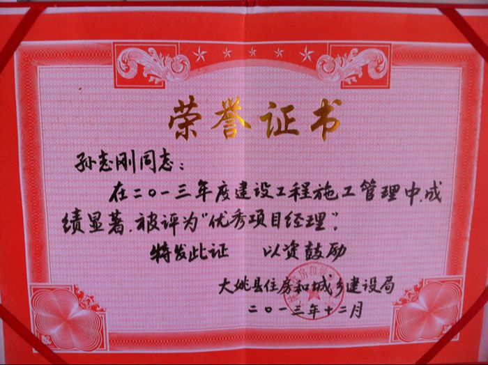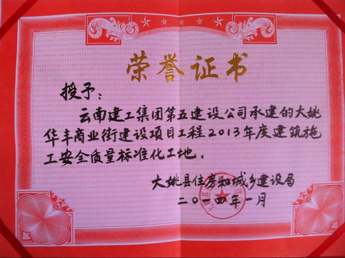 技術(shù)支持: 方森科技 近期,由公司五〇三直管項目部負責施工的大姚華豐商業(yè)街建設項目被大姚縣住房和城鄉建設局評為“2013年度建筑施工安全質(zhì)量標準化工地”,擔任此項目的項目經(jīng)理孫志剛同時(shí)被授予“優(yōu)秀項目經(jīng)理”稱(chēng)號。