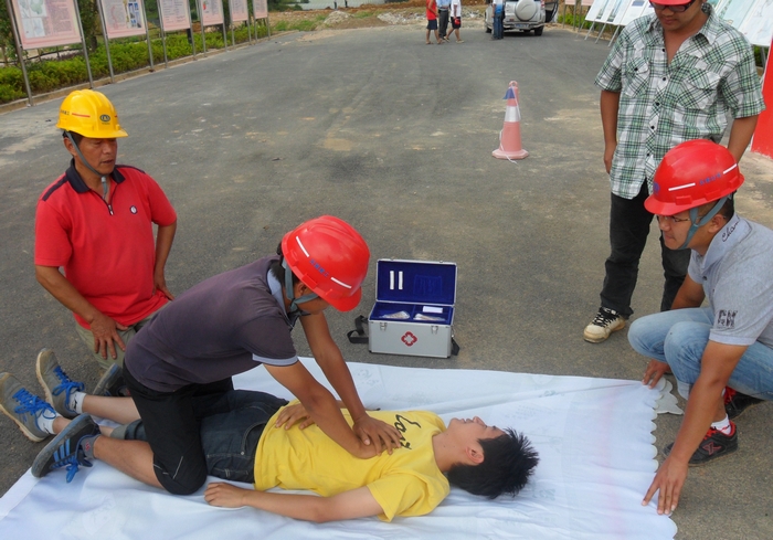 在安全管理員的指揮下,參演人員被分為3個(gè)組,每組4名成員進(jìn)行安全演練。下午兩點(diǎn)多,隨著(zhù)“受傷人員”被擔架抬出,救援演練正式開(kāi)始?!皞麊T”平躺于急救擔架上,每組人員分別演練了嘴鼻放氣、口對口人工呼吸和心臟擠壓等急救方法。在演練的過(guò)程中,大家邊操作邊講述急救要領(lǐng),理論和實(shí)際操作相結合起來(lái),收到了良好的效果。