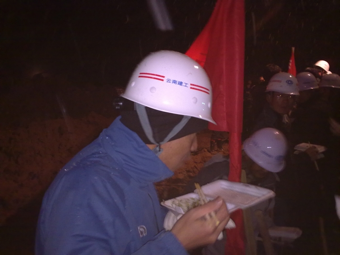 天色逐漸暗了下來(lái),氣溫也逐漸在下降,雖然參加救援的人好幾個(gè)小時(shí)沒(méi)喝一口水、沒(méi)吃一點(diǎn)東西,但仍然沒(méi)人放棄。晚上十點(diǎn),大家在奮戰了近十個(gè)小時(shí)后才匆匆忙忙吃了一盒盒飯。晚上十一點(diǎn),項目部參加救援的人員在總指揮的安排下,一部分撤離了救援現場(chǎng),項目部的趙登旭則留在了一線(xiàn)與救援人員繼續奮戰,直至1月12日的中午。