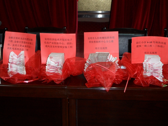 第一安裝直管部本次兌現的項目分別是:昆明市人民檢察院職務(wù)犯罪偵查指揮中心辦公樓安裝工程,兌現金額172407.03元;金江小區6#-10#地塊房屋建筑工程第三標段安裝工程,兌現金額70253.63元;金美百貨等改造工程,兌現金額17112.28元;昆明經(jīng)濟技術(shù)開(kāi)發(fā)區電子信息產(chǎn)業(yè)創(chuàng )業(yè)中心消防、通風(fēng)及室外管網(wǎng)工程,兌現金額100000元。四個(gè)項目在大會(huì )上獲得了相應的現金兌現。
