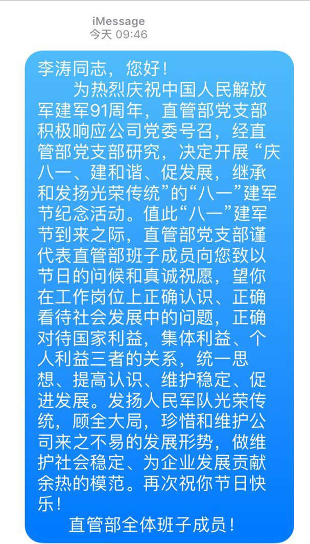 8月1日,第四直管項目部黨支部積極響應公司黨委號召,在直管部開(kāi)展主題為“慶八一、建和諧、促發(fā)展,繼承和發(fā)揚光榮傳統”的“八一”建軍節紀念活動(dòng)。 在“八一”建軍節到來(lái)之際,直管部黨支部書(shū)記陳德正代表黨支部和直管部領(lǐng)導班子向兩名復退轉崗軍人發(fā)送了慰問(wèn)短信,并以電話(huà)的方式再次向他們表達節日的祝福和問(wèn)候。望他們在工作崗位上正確認識、正確看待社會(huì )發(fā)展中的問(wèn)題,正確對待國家利...