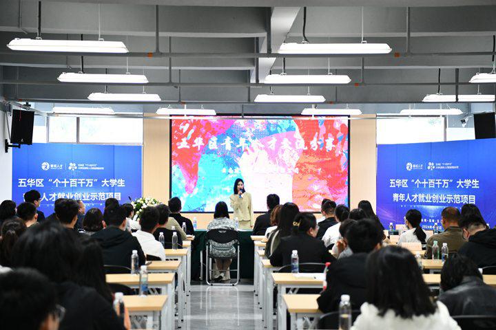 公司職工在五華區“個(gè)十百千萬(wàn)”大學(xué)生青年人才就業(yè)創(chuàng )業(yè)示范項目發(fā)布會(huì )進(jìn)行宣講