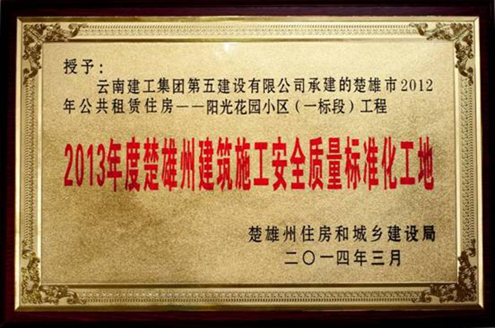 在2013年度楚雄州建筑施工安全標準化工地專(zhuān)家組核查驗收和州住房、城鄉建設局綜合評審中,由五〇三直管項目部施工的“楚雄市2012年公共租賃住房-陽(yáng)光花園小區(一標段)”工程項目,榮獲“2013年度楚雄州建筑施工安全質(zhì)量標準化工地”稱(chēng)號【楚住建發(fā)(2014)56號文】。并于2014年5月6日正式授牌。 獲此殊榮,項目管理團隊...